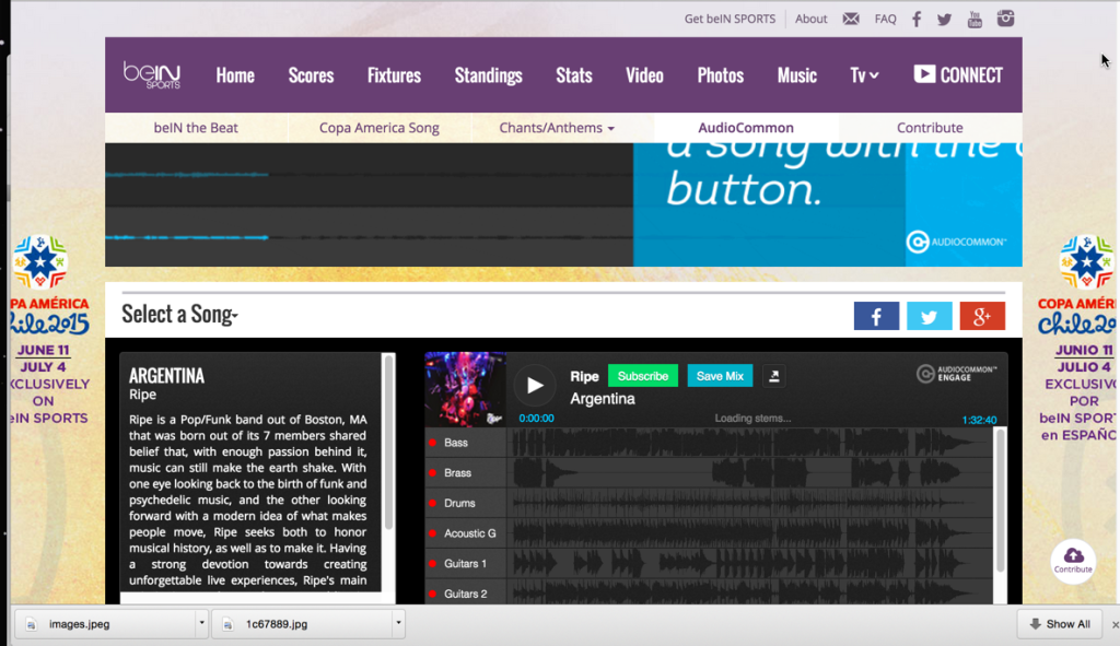 Our site featured original songs, chants, and videos created by Berklee musicians. Later, anthems for each country were added. To engage fans, the site allows anyone to upload their own song, chant or video related to Copa America or one of the teams competing in the tournament. Additionally, the project enlisted music tech company AudioCommon to enable fans to play producer by mixing the stems of selected songs into unique mixes of their own.